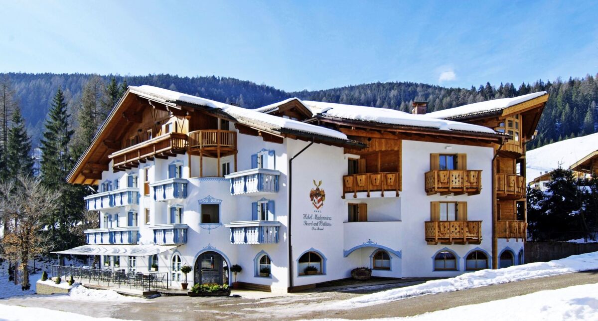 Hotel Madonnina to rodzinny obiekt idealnie wpisujący się w górski krajobraz Soraga di Fassa, położony zaledwie 300 m od centrum i przystanku skibusu, w otoczeniu masywów Catinaccio, Rosengarten i Monzoni. Jego nowoczesna strefa wellness i kryty basen sprawiają, że pobyt łączy w sobie aktywny wypoczynek ze spokojem i regeneracją. Hotel przyjazny rodzinom, przyjmujący zwierzęta i doskonale wyposażony – posiada restaurację, bar, przestronne lobby, taras-solarium, garaż i prywatny parking. Obsługa mówi po angielsku, niemiecku i włosku, a oceny gości (9,5/10) potwierdzają wysoką jakość usług.