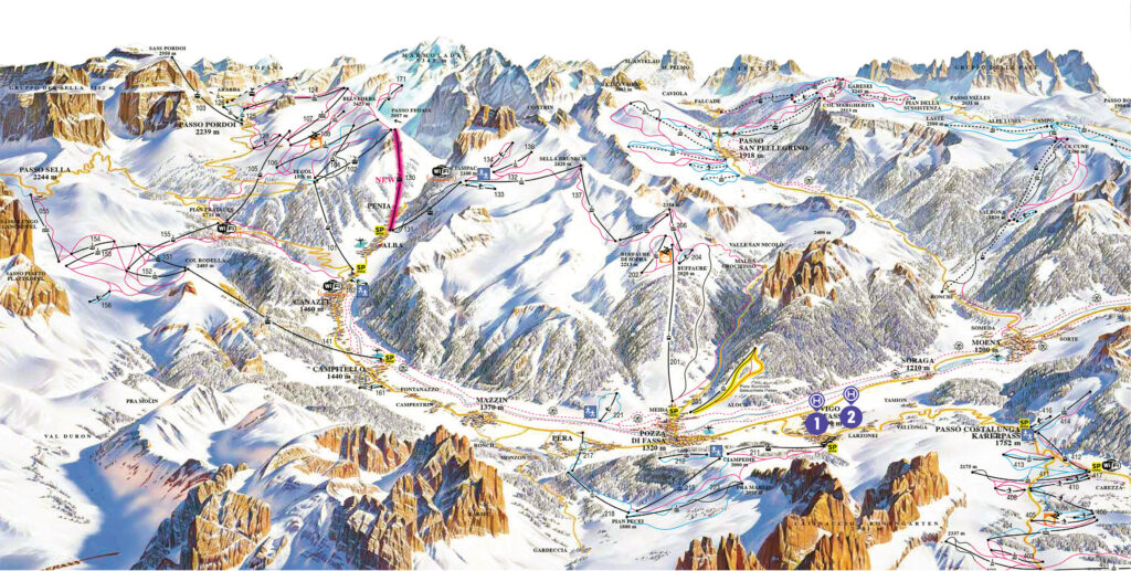 Val di Fassa wchodzi w skład największego włoskiego kompleksu Dolomiti Superski (ponad 1200 km tras), co daje możliwość korzystania z legendarnych tras jak Sellaronda – pętli wokół masywu Sella, jednej z najpiękniejszych tras narciarskich na świecie.